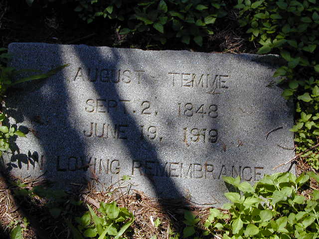 Note: Through my research, I believe that Melvina Temme, wife of August and mother of Herman, is also buried here. I did not find a headstone for her. I am not sure of her date of birth but I believe her date of death is Aug. 30, 1925. |