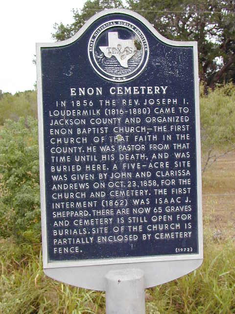 Cemetery is located on the east side of Hwy 111, approximately 8 miles north of Edna, Texas. There is an historical marker located to the right side of the entrance. The entrance is fenced and gated with a cattle guard. The cemetery is located a little over a quarter of a mile past the entrance and enclosed by a chain link fence. Placed inside the fence is a stone monument in commemoration of the past members of the Enon Baptist Church and their descendants.